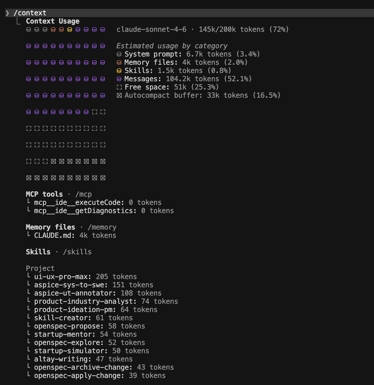/context详细展示当前 context 中各部分的 token 占用情况。在 skill 开发、Agent 开发和调试场景中特别有用——帮你找到"context 吃去哪了"。